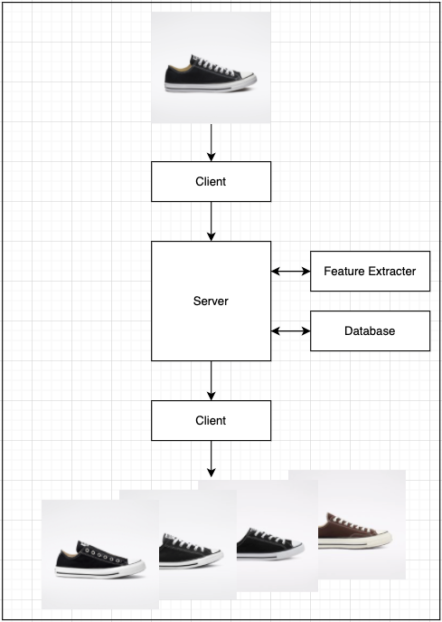 사용자의 요청에 따라 Server는 Machine을 이용해 비슷한 이미지 후보군을 뽑은 후 Database에서 해당 상품 리스트를 Client에게 전달한다.