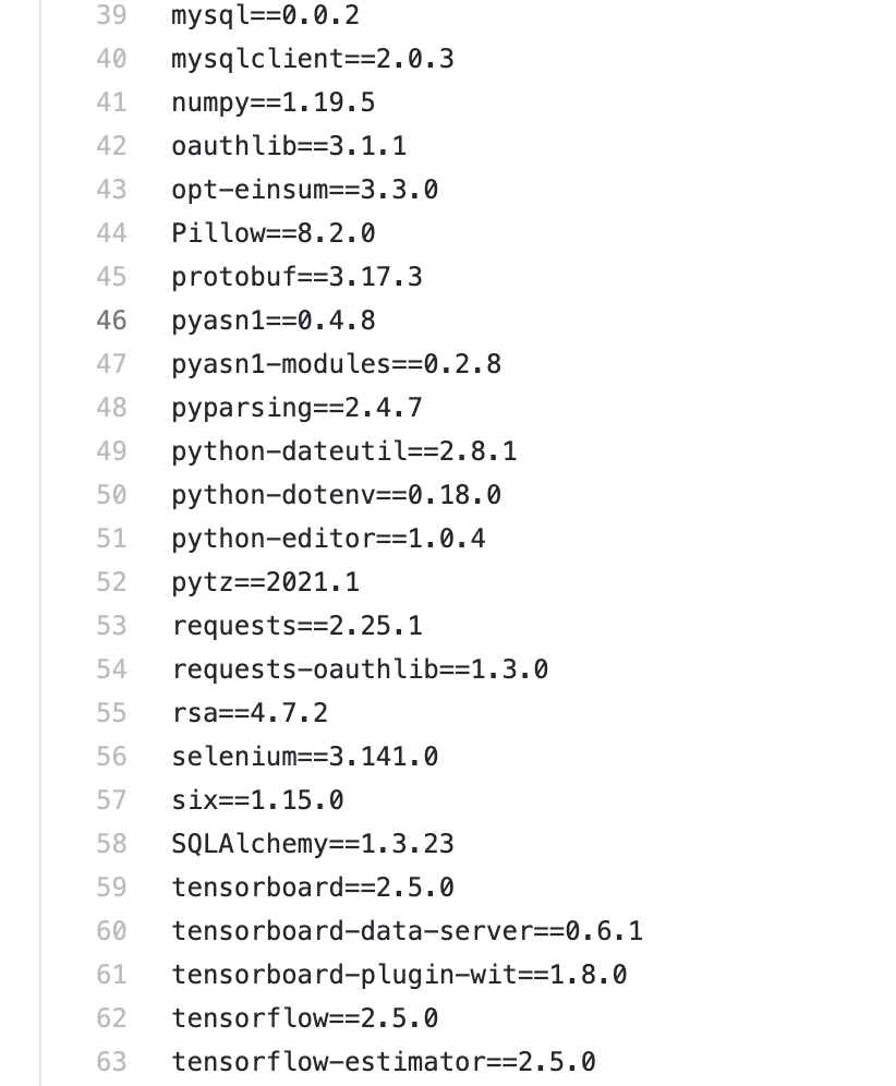 먼저, tensorflow, python 등의 버전에 따라서 모델이 Server에서 돌아가지 않을 수도 있기 때문에 버전을 확인한고 requirement.txt 파일을 만들어준다.