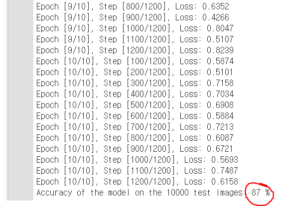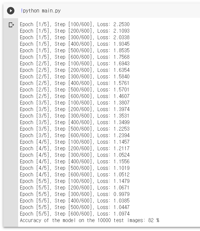 마지막 문장을 보면 10000개의 test image 들을 대상으로 정확도가 82% 나온 것을 확인할 수 있다.